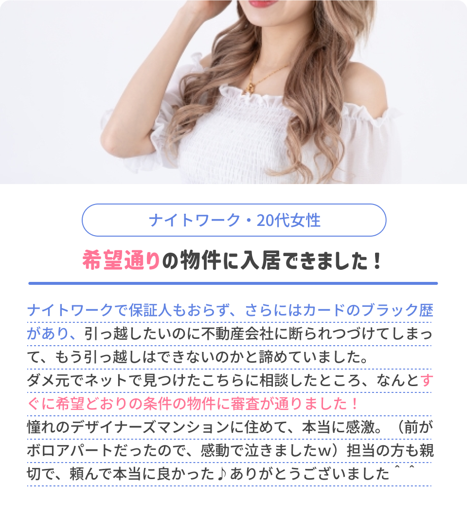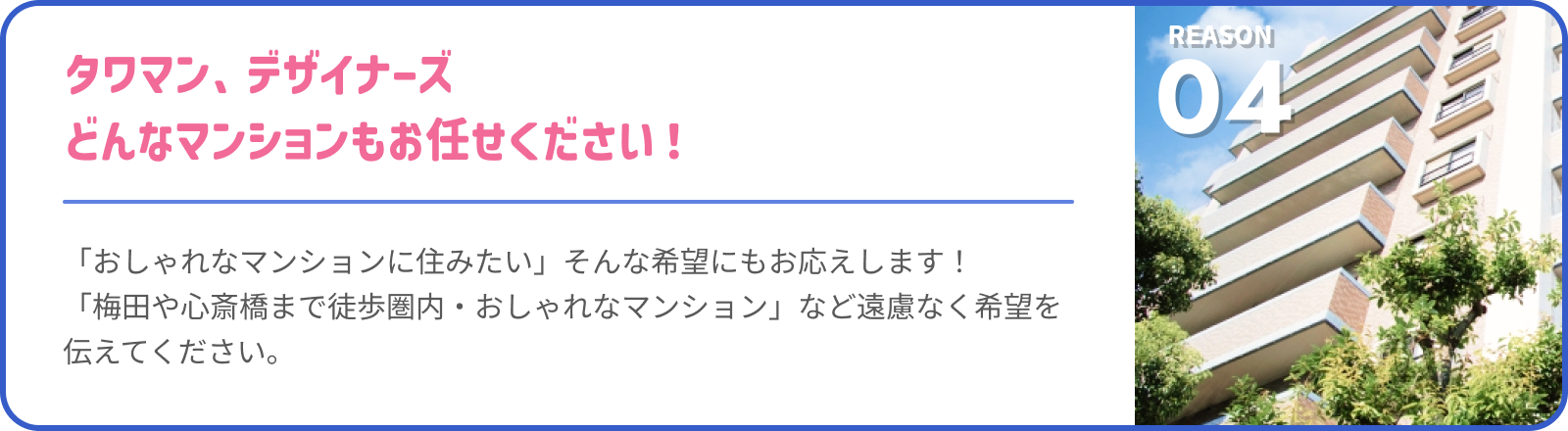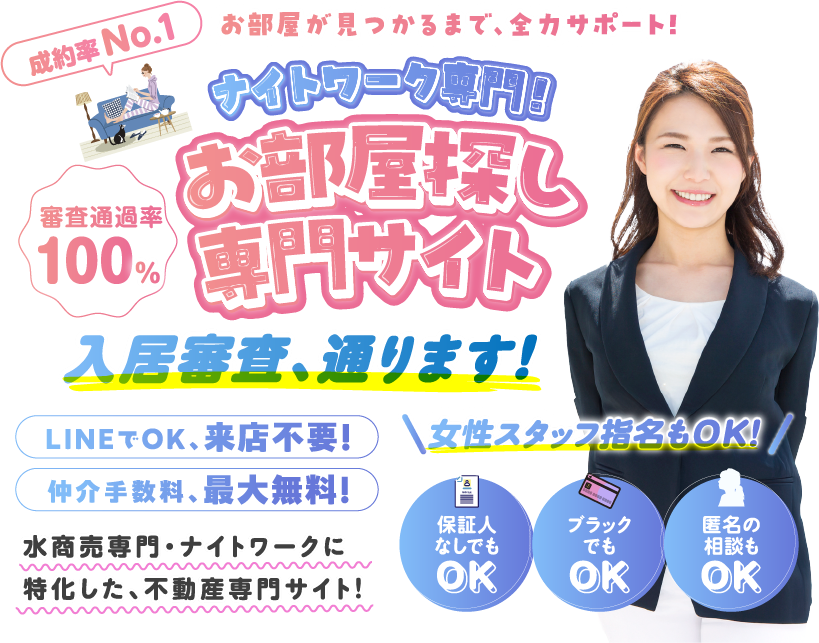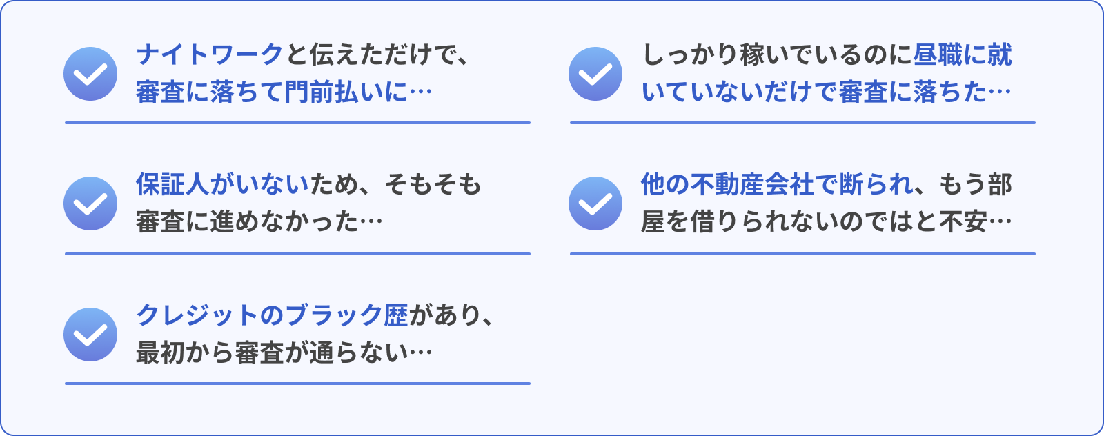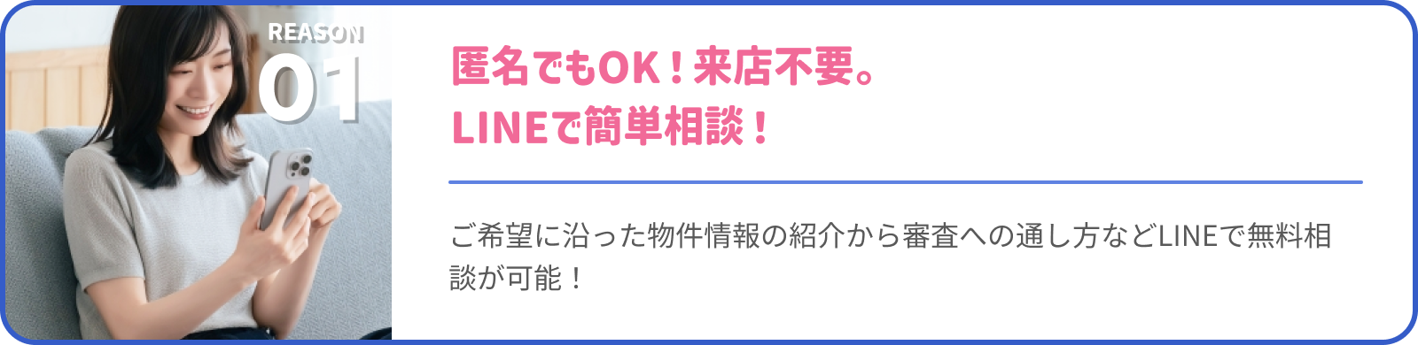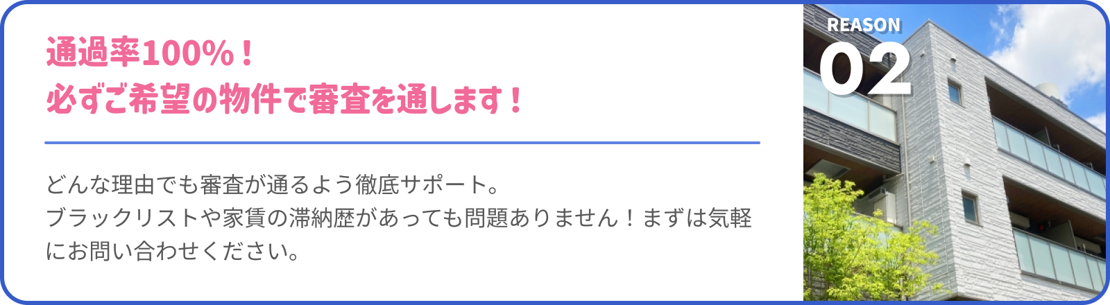 - ご安心ください。お客様のご事情や状況に合わせて、審査に支障のない物件をご紹介いたします。さらに、ご希望条件にできる限り近い物件を提案させていただきます。