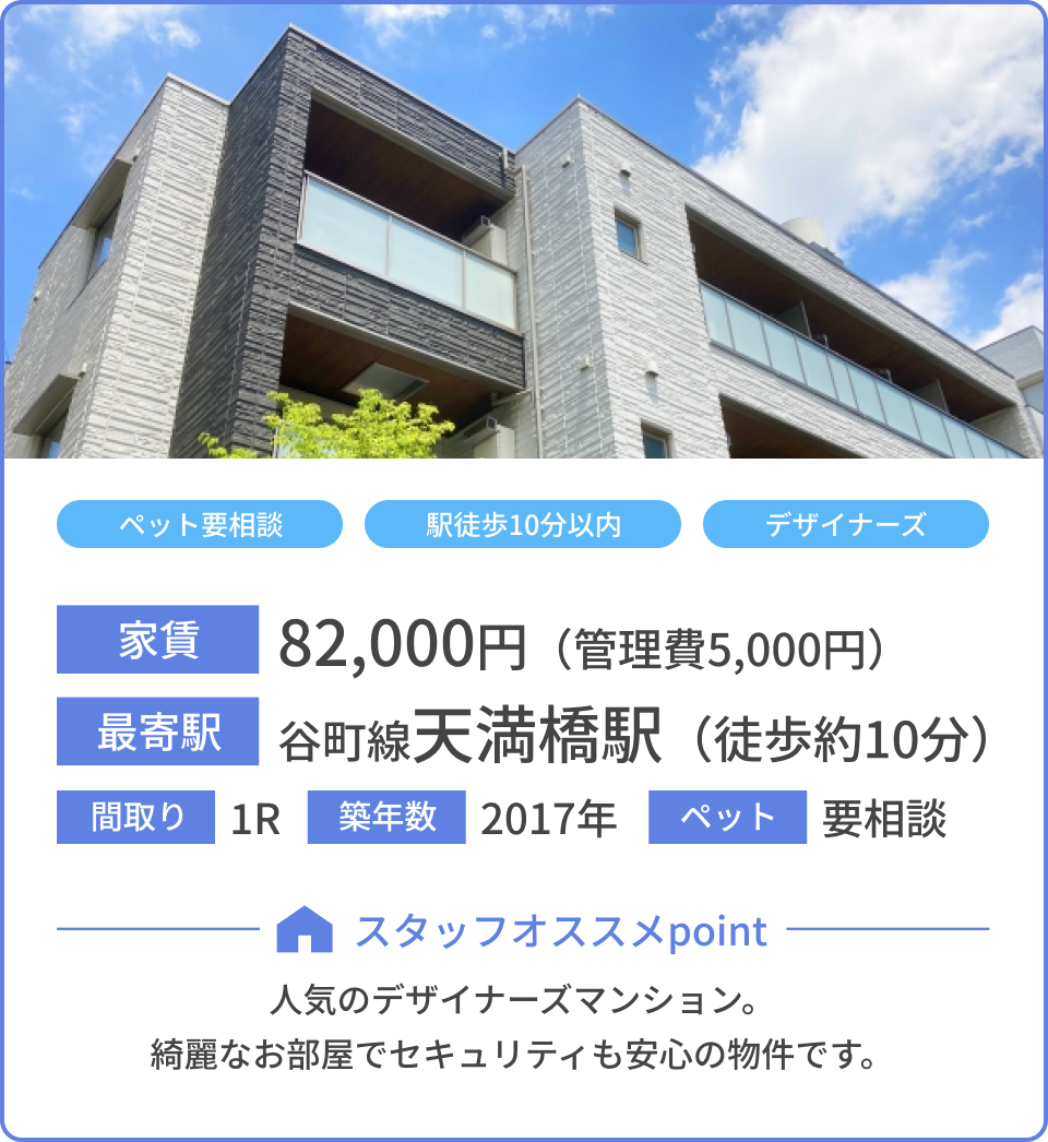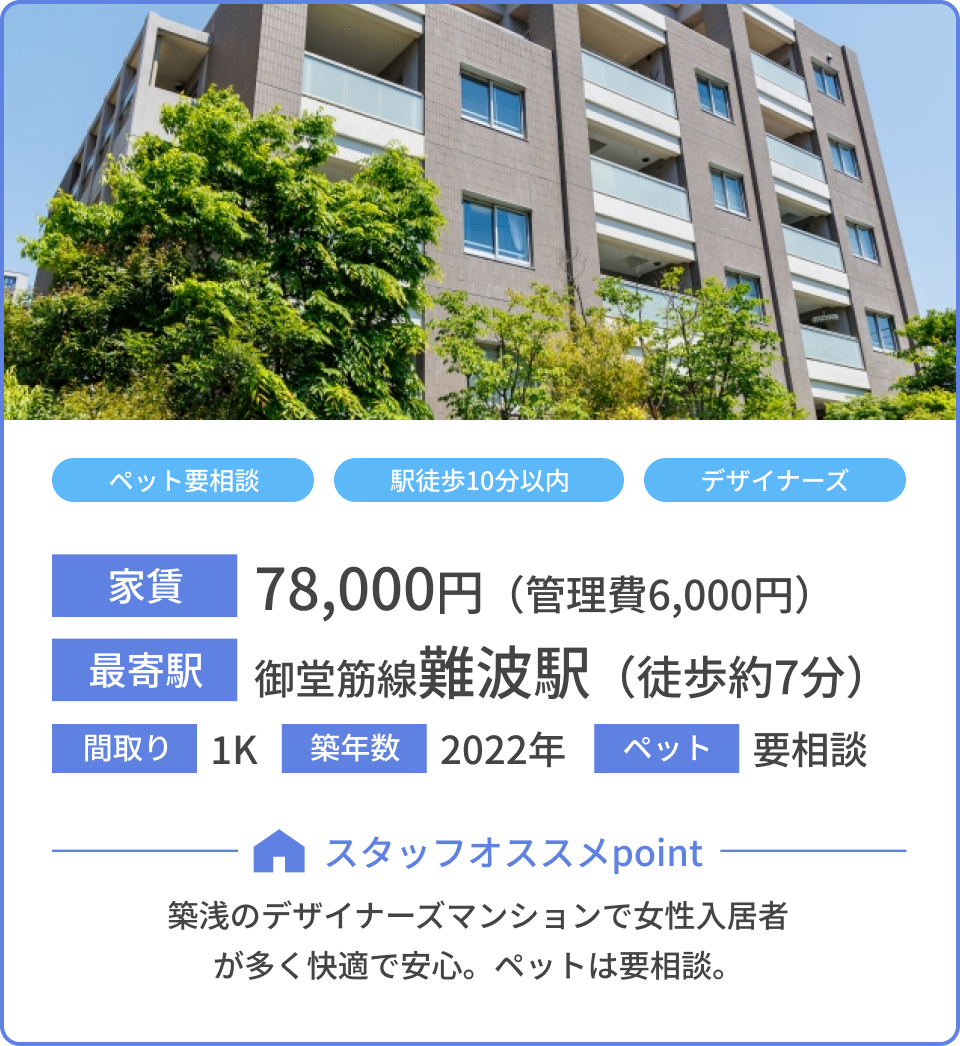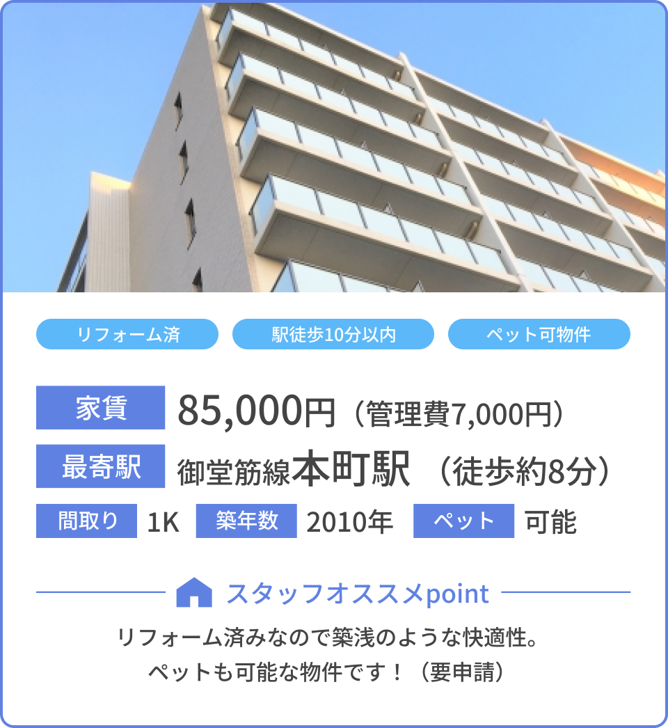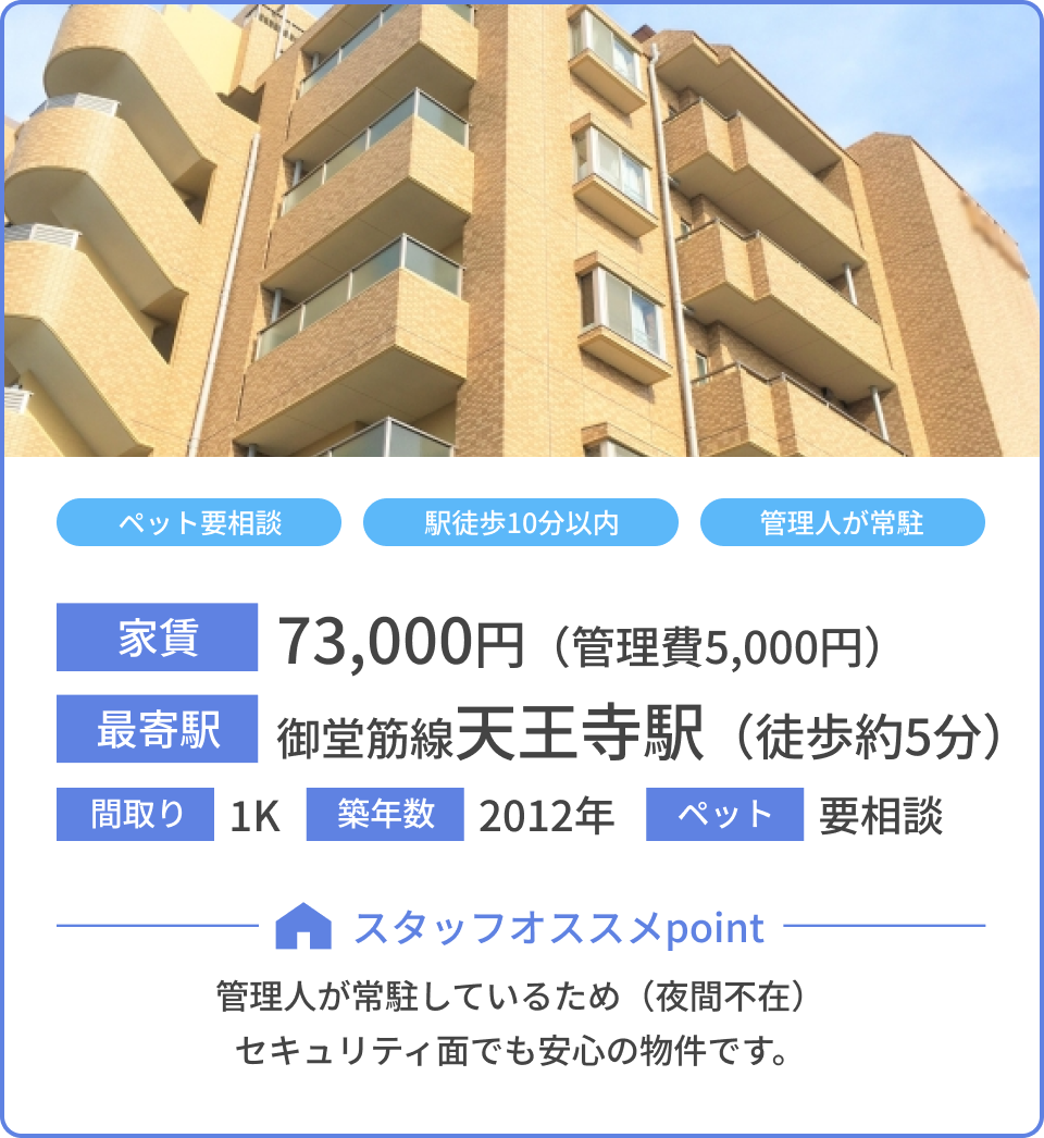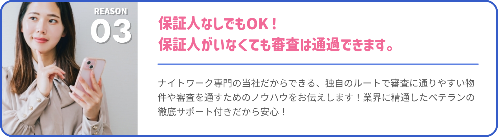 - ご安心ください。お客様のご事情や状況に合わせて、審査に支障のない物件をご紹介いたします。さらに、ご希望条件にできる限り近い物件を提案させていただきます。